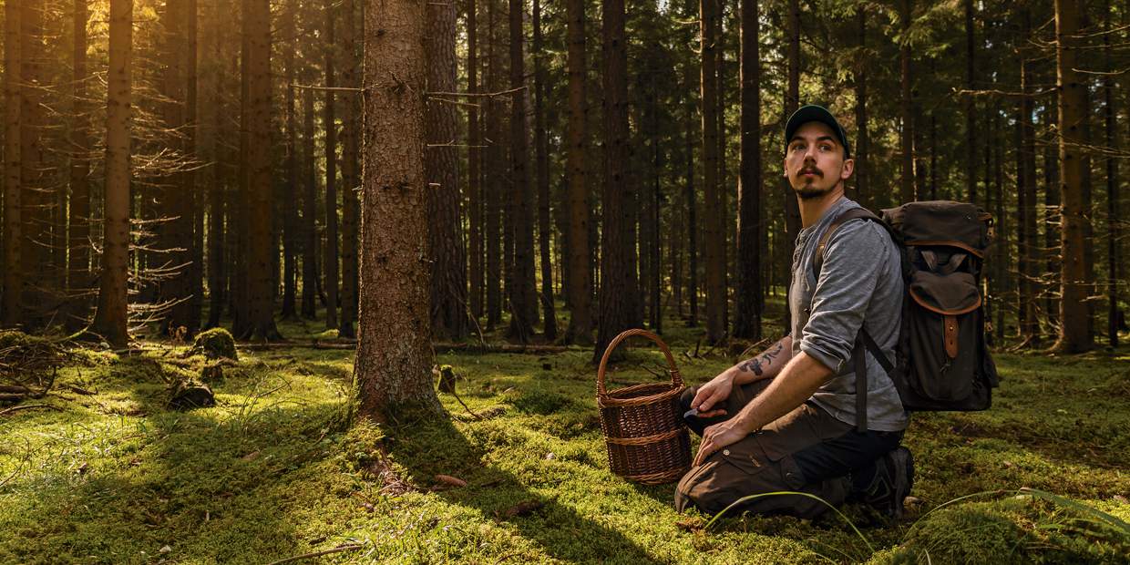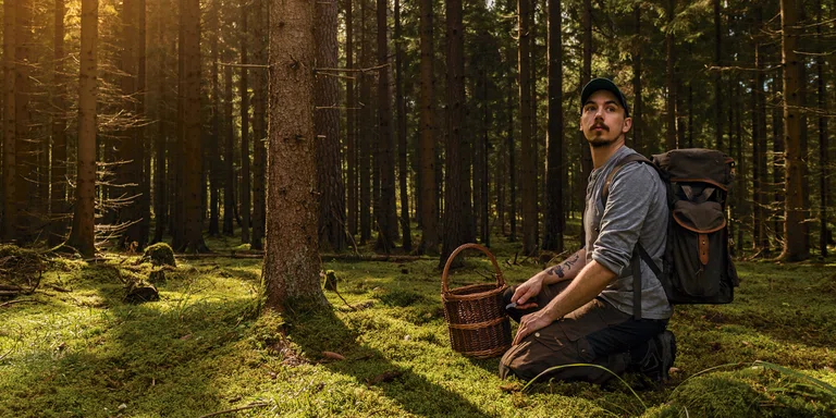 "alt": "Niki Sjölund, professional forest forager, is kneeling in a green forest."