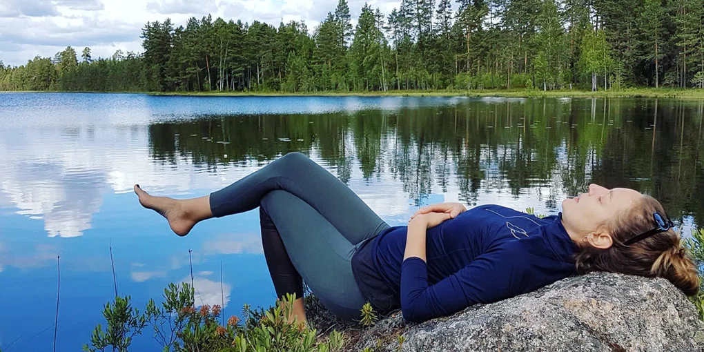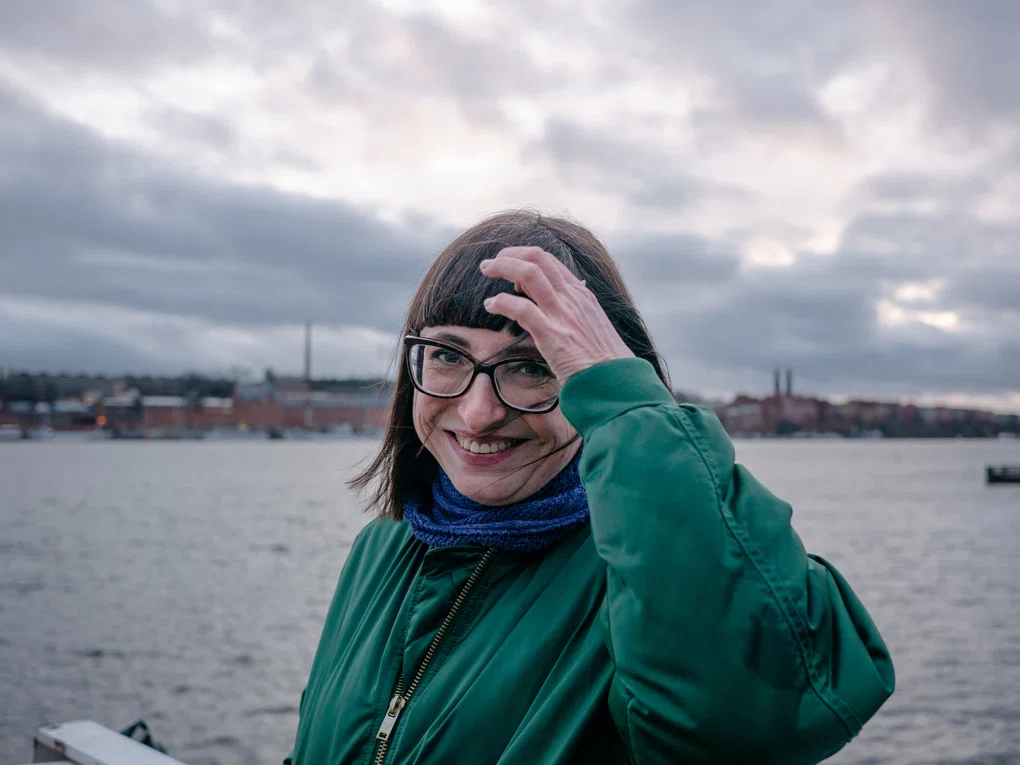 "alt": "Karin Skelton, nature-lover, takes a break by a lake in Sweden."