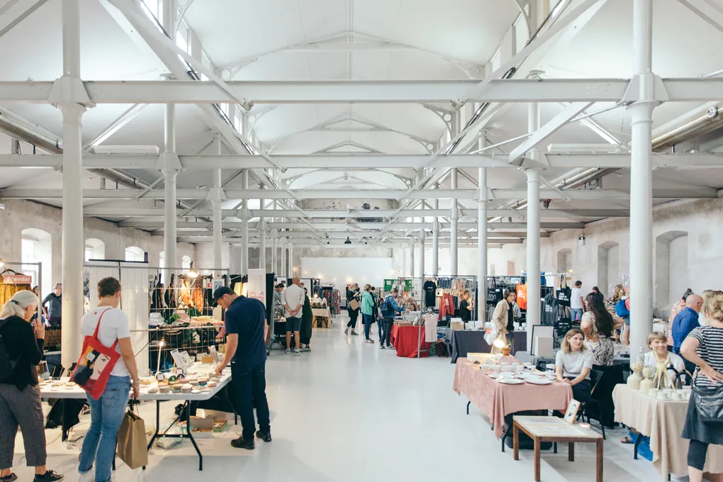 "alt": "People browsing and selling handmade crafts, clothes, and design items inside a bright industrial hall with high ceilings and metal beams.",