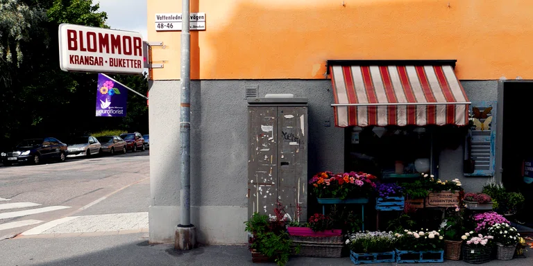 "alt": "Storfront on a quiet street in Midsommarkransen, a suburb west of Södermalm in Stockholm. In the early years of the 21st century the area transformed from run-down to trendy, with lots of cafes and boutiques opening up."