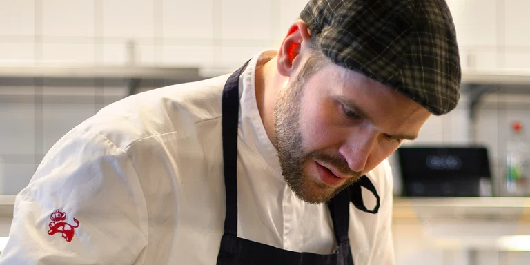 "alt": "David Lundqvist, head-chef at Grand Hotel Saltsjöbaden, working in the kitchen. David was named Swedish Chef of the year 2018."