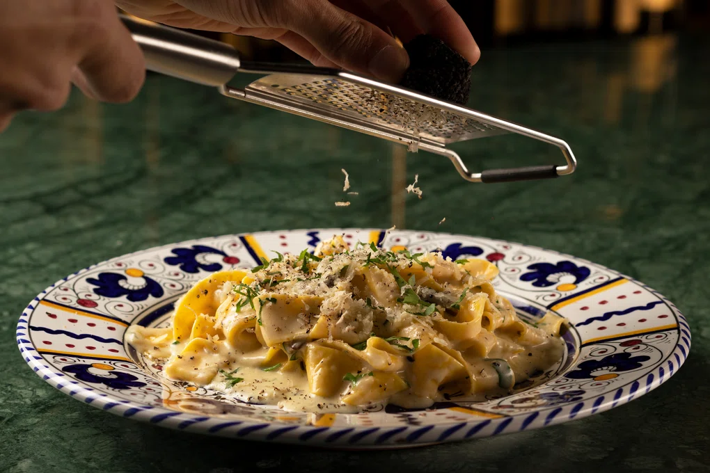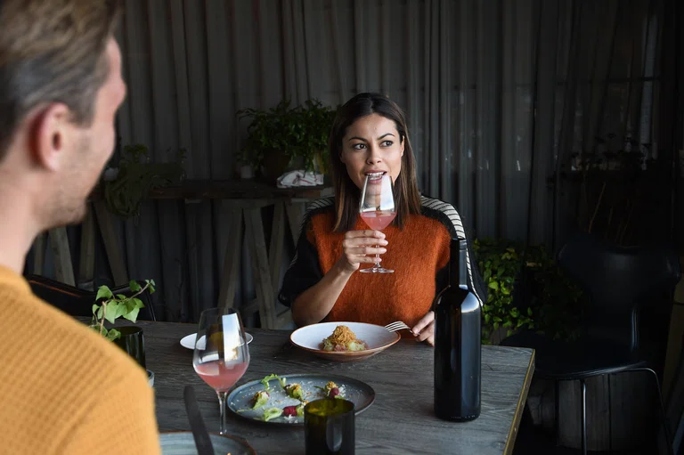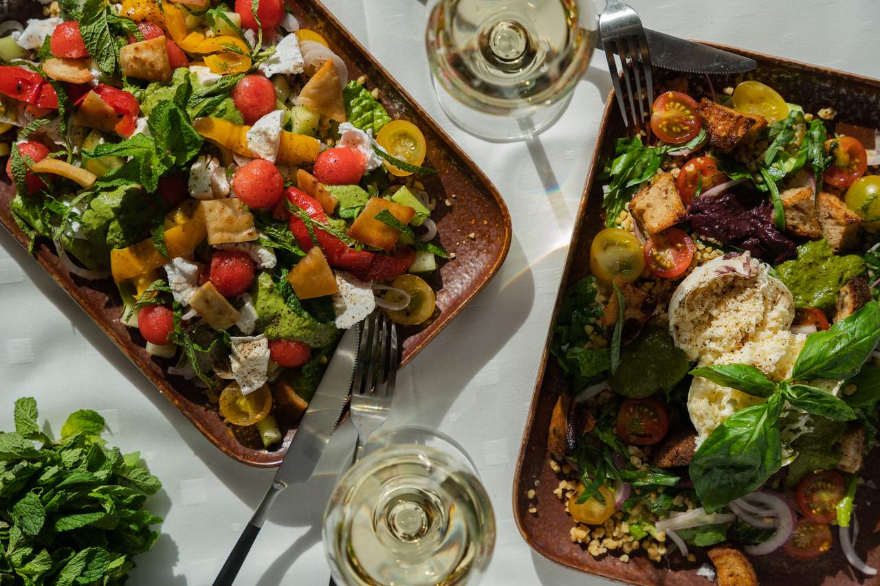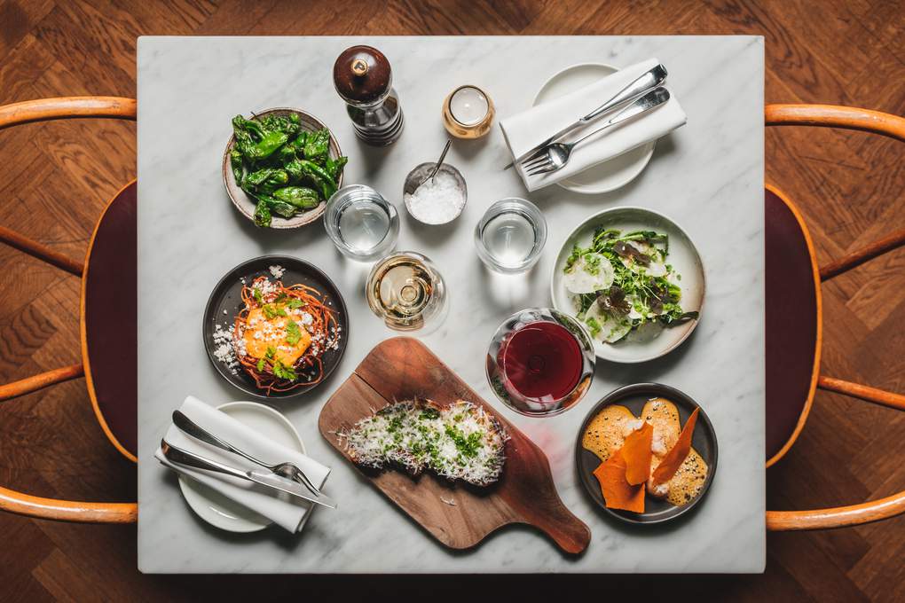 "alt": "A group of people are sharing a few pizzas at Bistro Bananas, the food is as trendy as the minimalist table settings and decorated with fresh herbs."