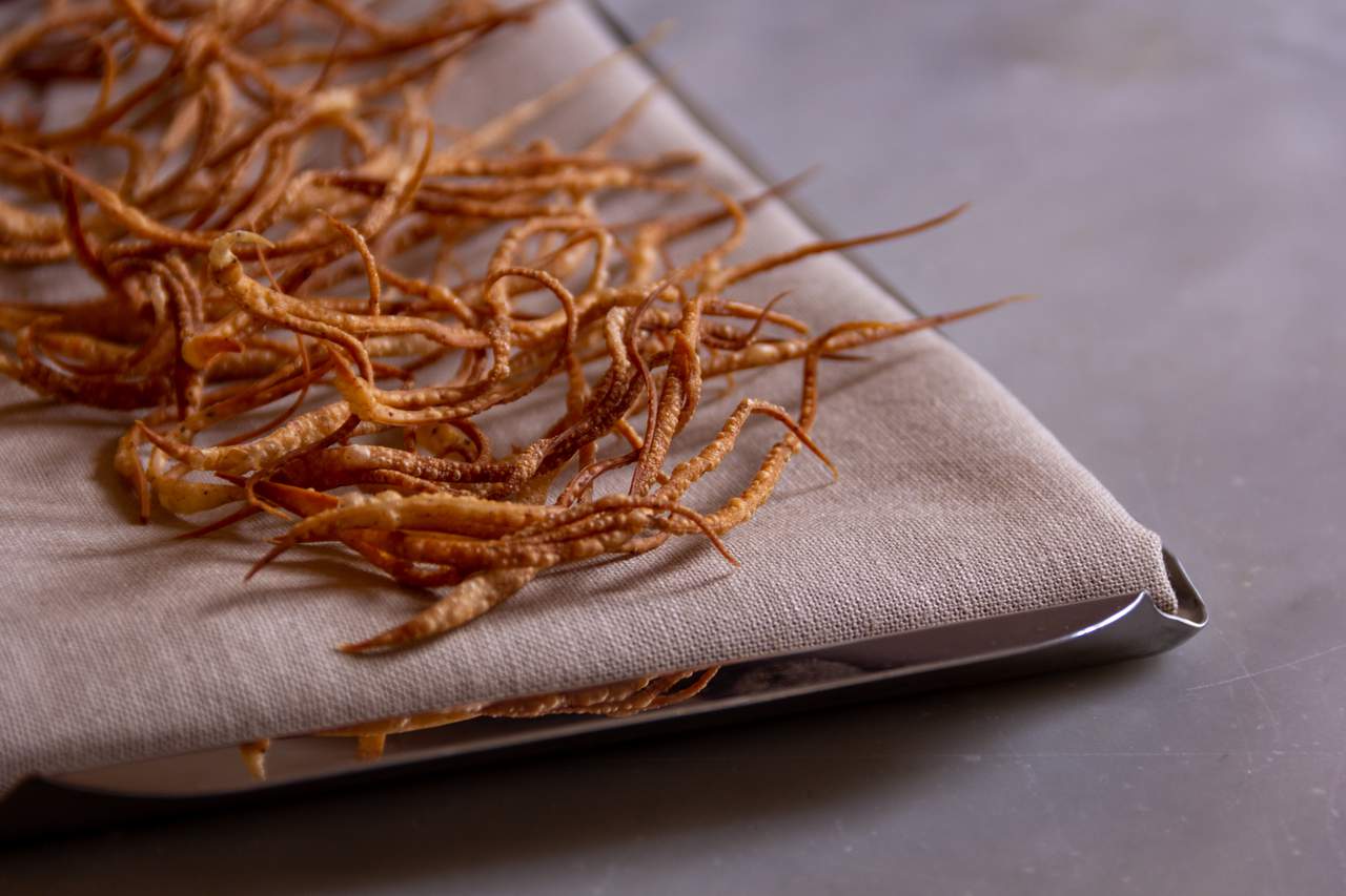 "alt": "Restaurants in Stockholm. Sayan Iskassons Nour. A tray of deep fired food at the fine dining restaurant.",