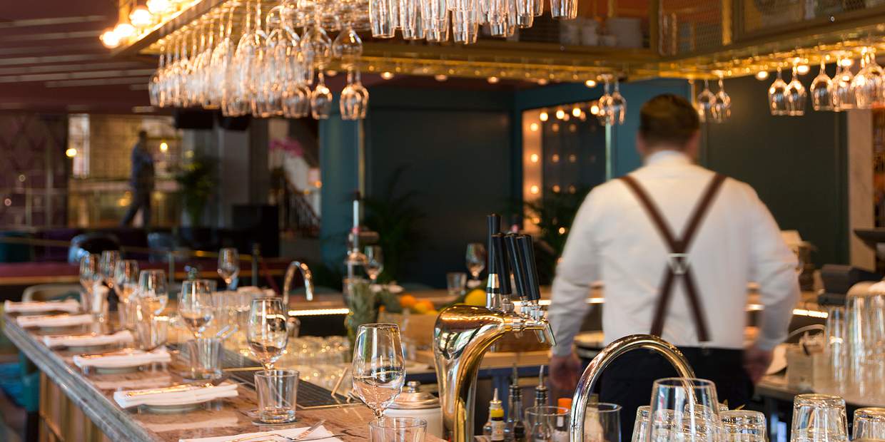 "alt": "The bar at Haymarket is set for dinner with cutlery and glasses in front of each bar stool. Glasses hang above the bar in the usual style of an urban bar in the city.",