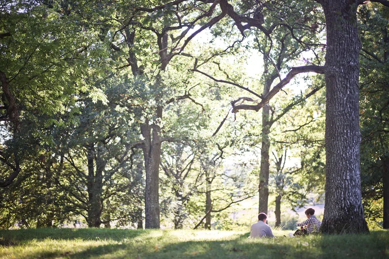 "alt": "Two people walk over a bridge in Djurgården, a large parkland area in Stockholm",