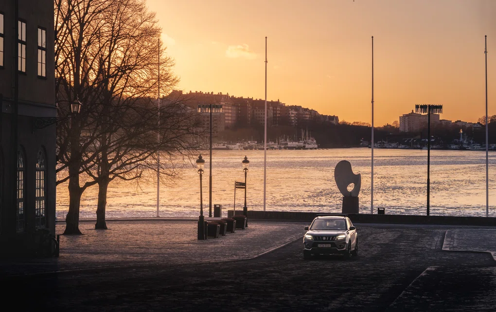 "embeddedTextCaption": "Travelling in Stockholm. A car drives along Riddarholmen during sunset.",