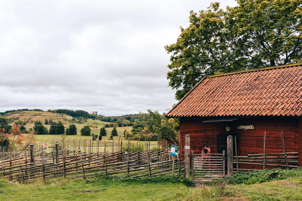 "alt": "Activities in Stockholm. A picture of a farmshed at Akalla 4H, with Järvafältet stretching out in the horizon.",