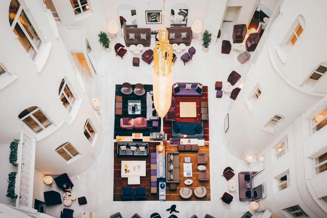"alt": "Design hotels in Stockholm. The bright lounge at Nobis hotel. Various chairs and soffas stand on a white floor, creating small seating groups for hotel guests to realx at.",