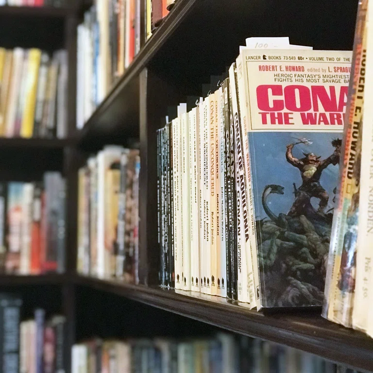 "alt": "Shopping i Stockholm. Södermalm. Närbild på böcker i Stockholms Science Fiction Antikvariat.",