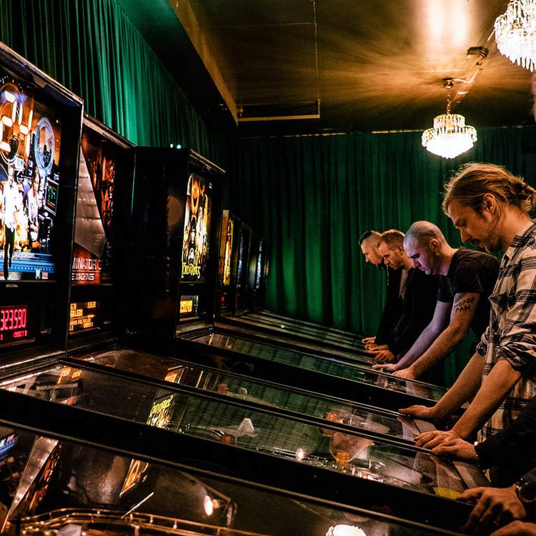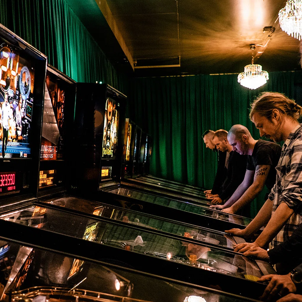 "alt": "Aktiviteter i Stockholm. Uggland Boule & Bar, Södermalm. Flipperhallen är på Södermalmsbaren är full. På bilden syns flippermaskiner uppställda på rad, och vid varje maskin står en fokuserad spelare.",