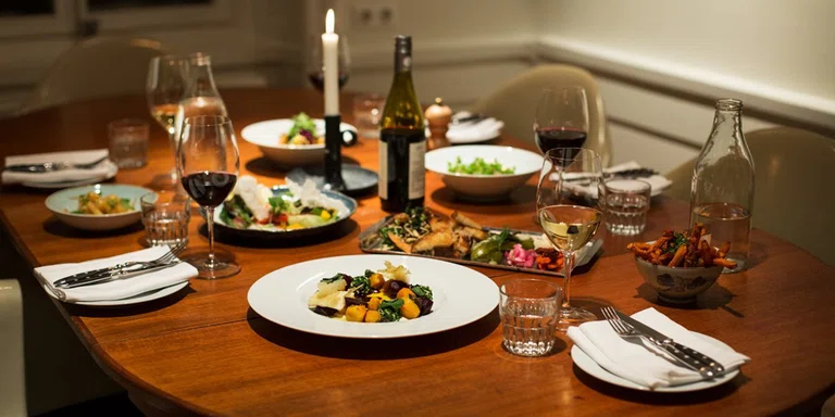 "alt": "Restauranger i Stockhom. Växthuset på Södermalm. interiör. Talrikar med mat står dukade på ett bord på Växthuset, nattklubben Under Brons vegetariska restaurang.",
