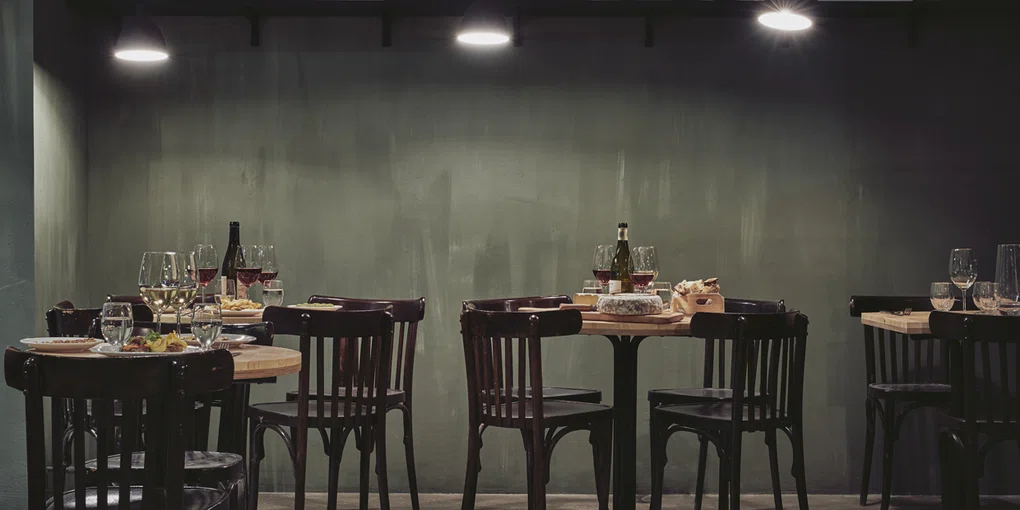 "alt": "Dark green walls and black furniture in the wine bar Tyge & Sessil. The effect of the tables against the walls are quite beautiful."