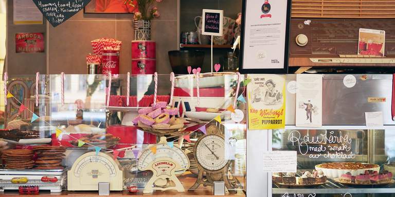 "alt": "Cafés in Stockholm. Delicious-looking pastries on display at Art Bakery, a café located in the NK department store in central Stockholm."