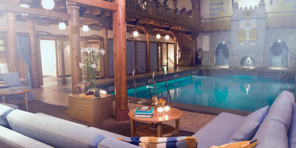 "text": "Njut av lyxig spamiljö från slutet av 1800-talet, med bassäng, träningsutrustning och behandlingar från topp till tå. Sällskap på upp till 20 personer kan också hyra den privata badvåningen ”Turkiska Badet”.",