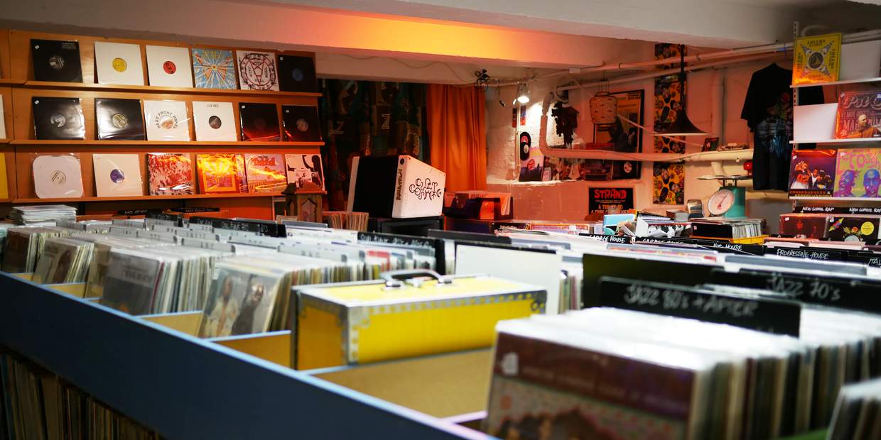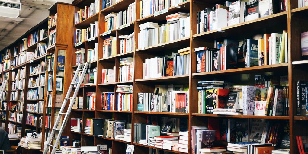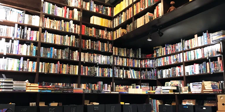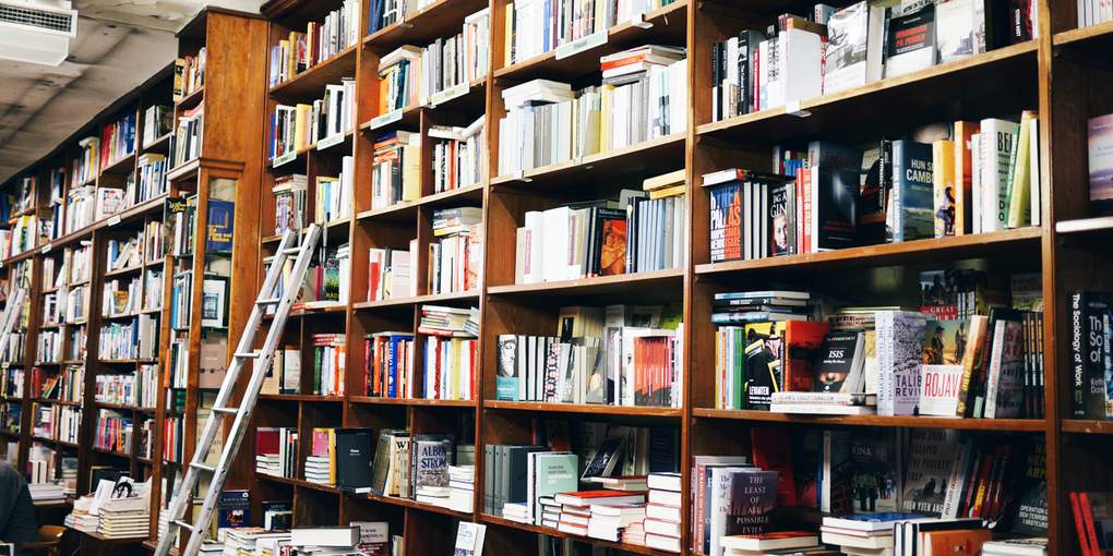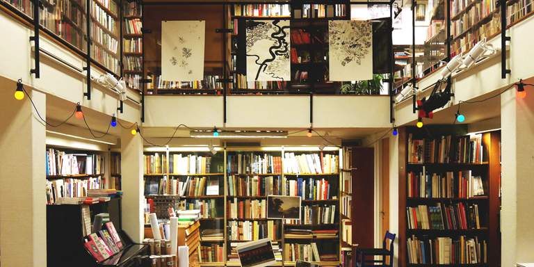"alt": "Vintage shopping in Stockholm. Shelves full of different books at Stockholms Science Fiction Antikvariat.",