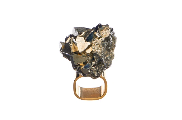"alt": "Design i Stockholm. Närbild på ring, designad av Märta Larsson. Ringen är guldfärgad, med en stor asymmetrisk sten på ovansidan.",