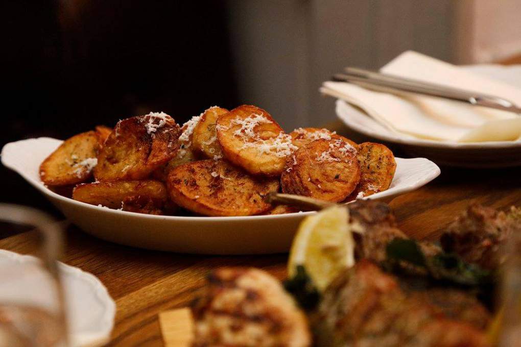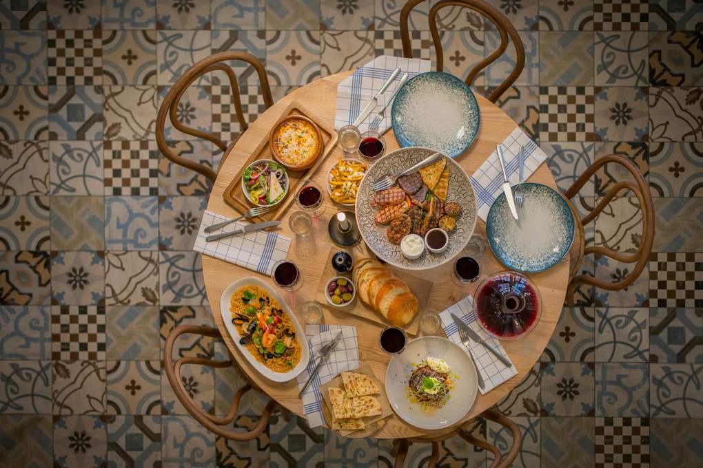 "alt": "Restaurants in Stockholm. A table set for dinner at the Greek-restaurant Esperia. Olives, souvlaki, red wine and more.",