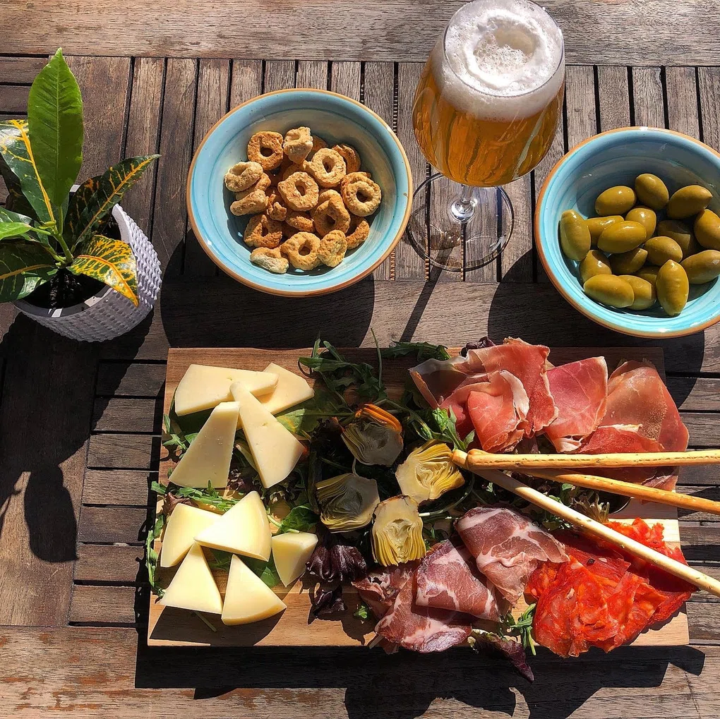 "embeddedTextCaption": "a view of various antipasti on a wooden table, served with a glass of beer",