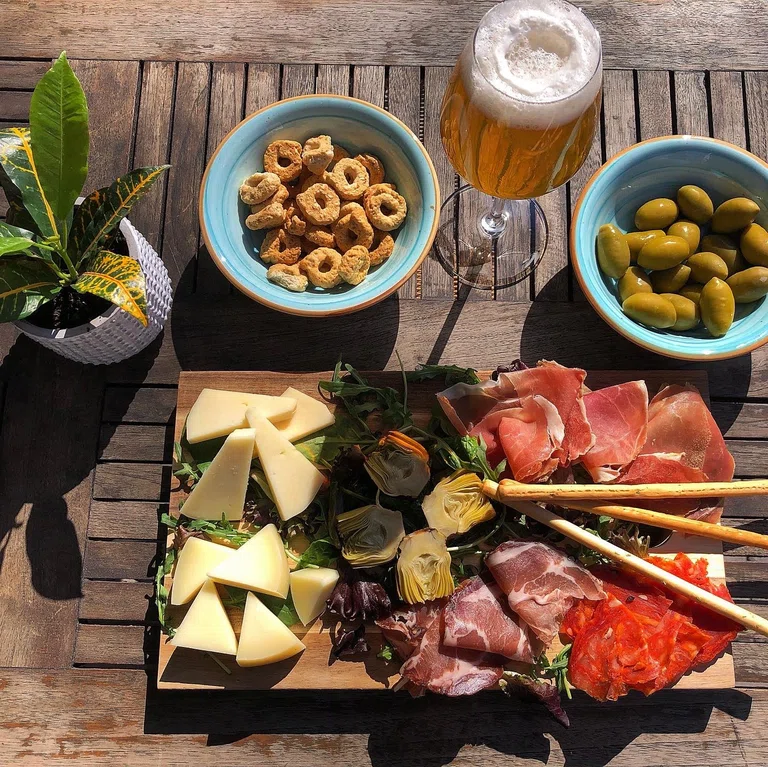"alt": "a view of various antipasti on a wooden table, served with a glass of beer",