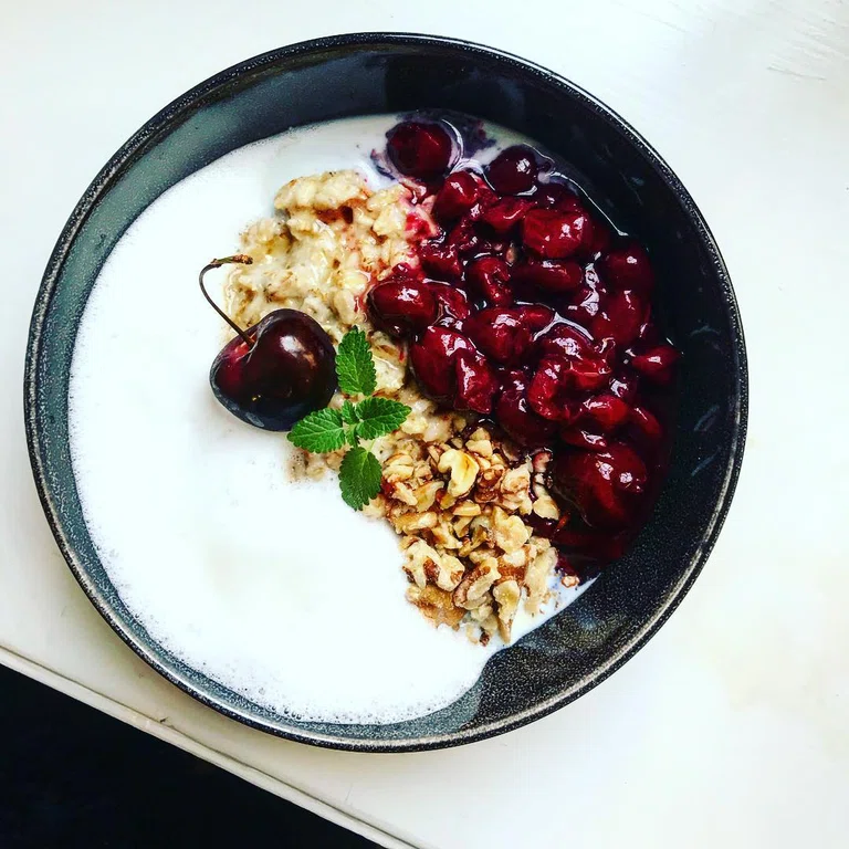 "alt": "Cafés in Stockholm. A bowl of porridge with cherries at Grain Café.",