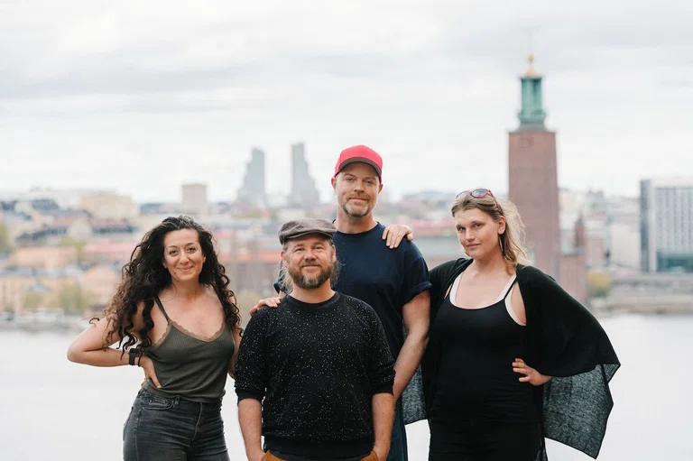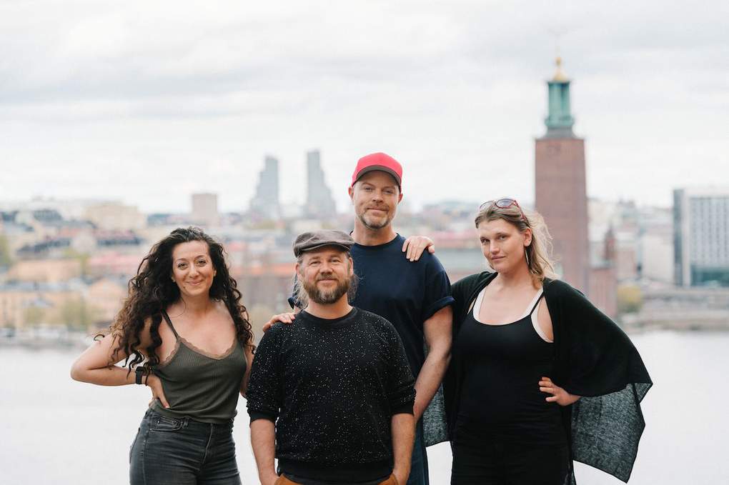 "embeddedTextCaption": "Four persons standing and smiling with Stockholm City Hall in the background.",