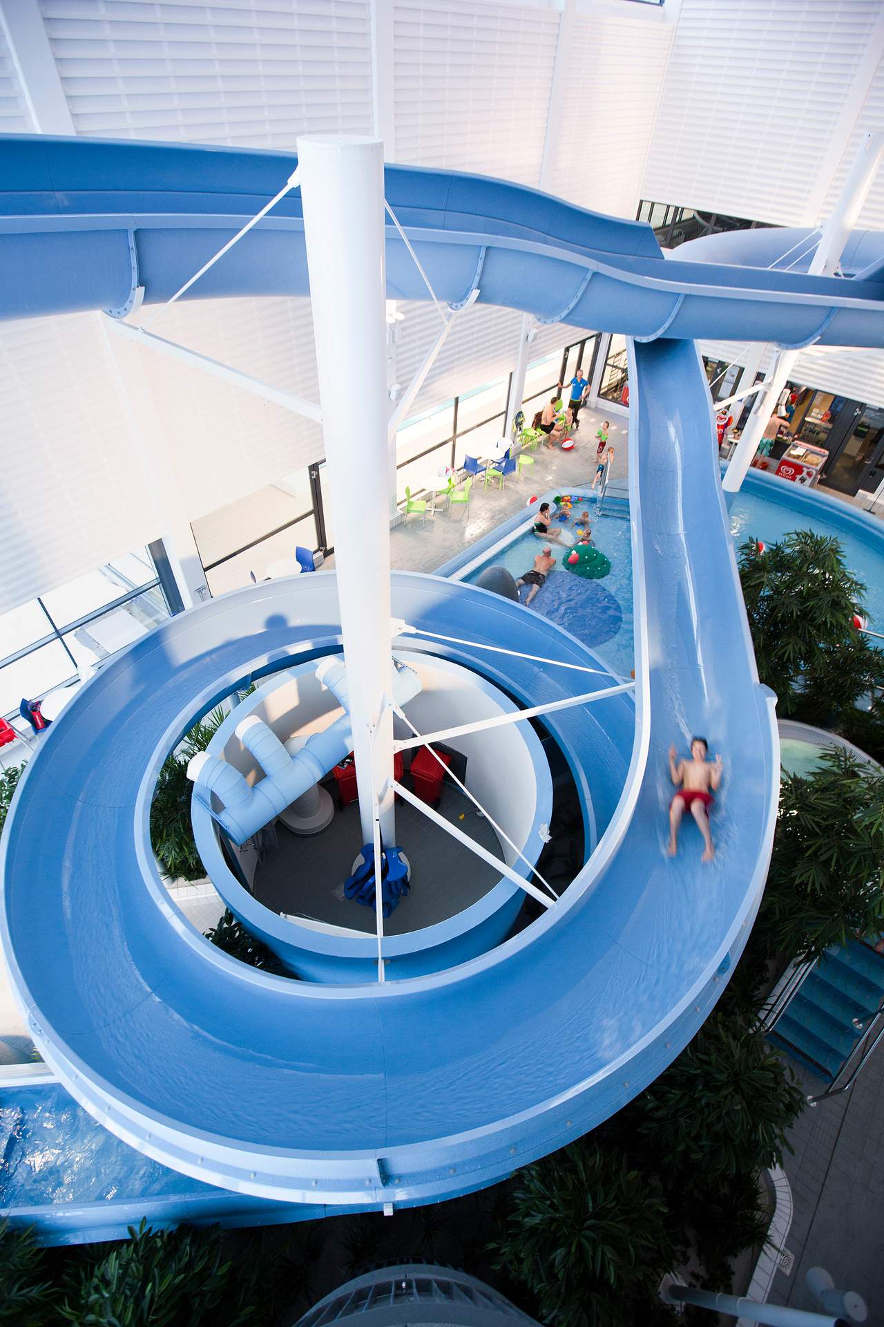 "alt": "Swimming pools in Stockholm. A teenager rides down a water slide at Tyresö Aquaarena.",