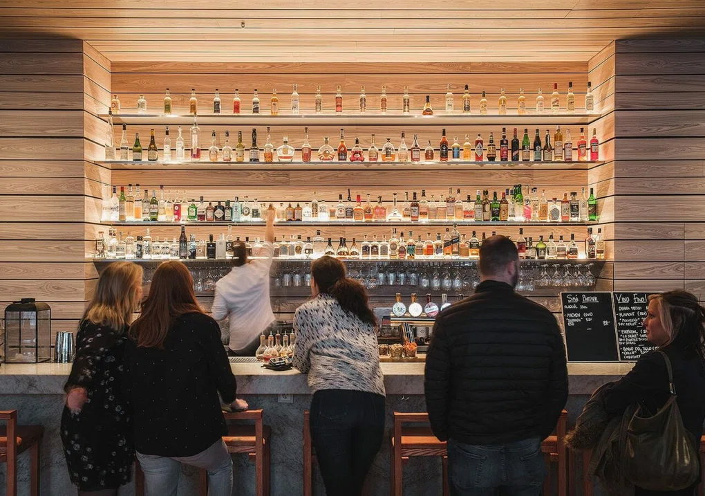 "embeddedTextCaption": "A bar built with birght fir planks and a large illuminated glass shelf with spirits. A bartender is serving drinks to the visitors.",