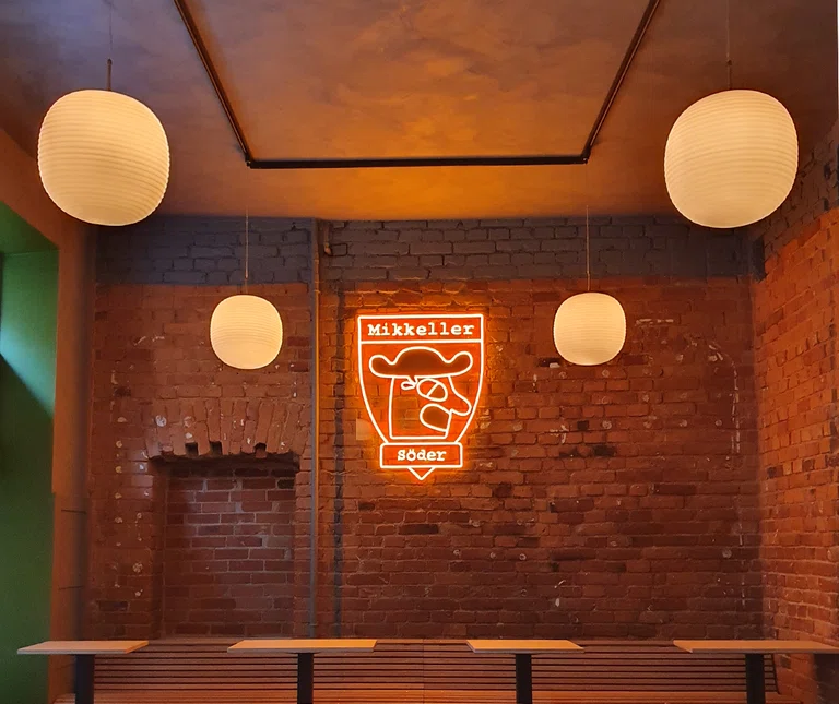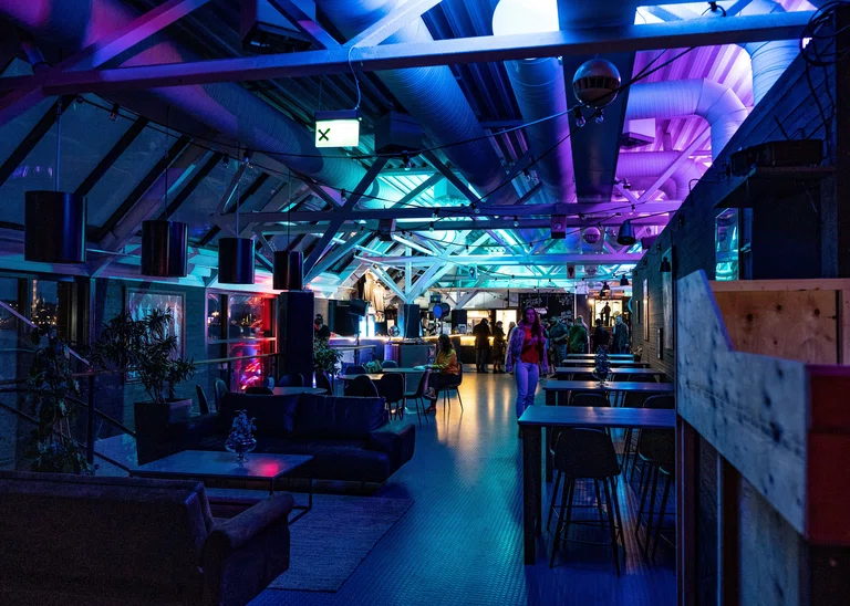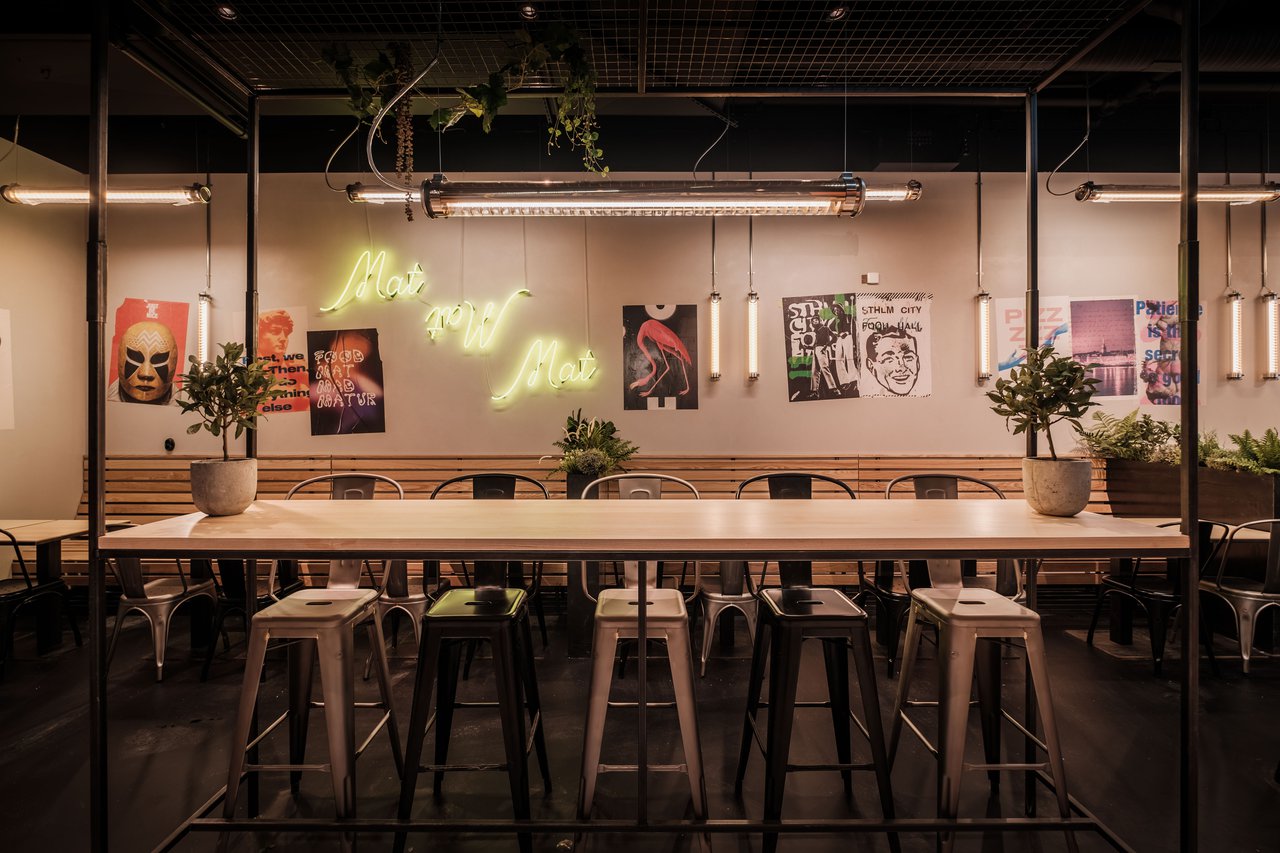 "alt": "Restaurants in Stockholm. Sthlm City Food Hall in central Stockholm. Empty tables and chairs in a neon-lit room.",