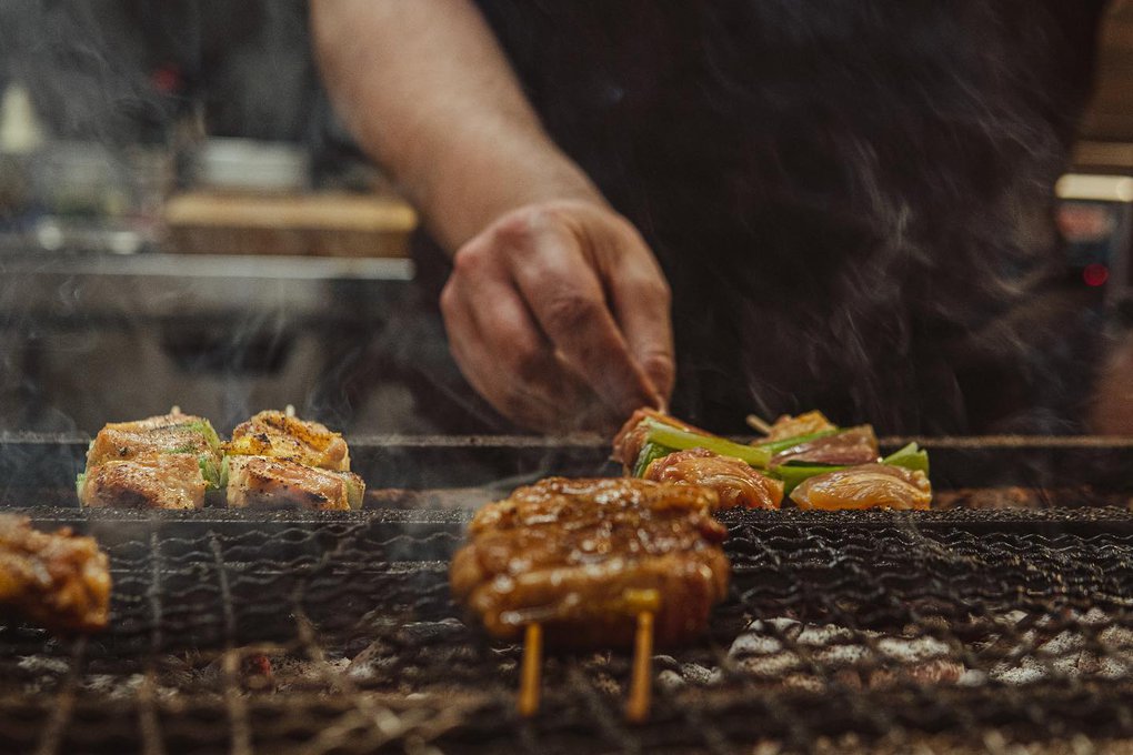 "alt": "Restaurants in Stockholm. A chef is turning skewers over an open flame at Miyakodori.",