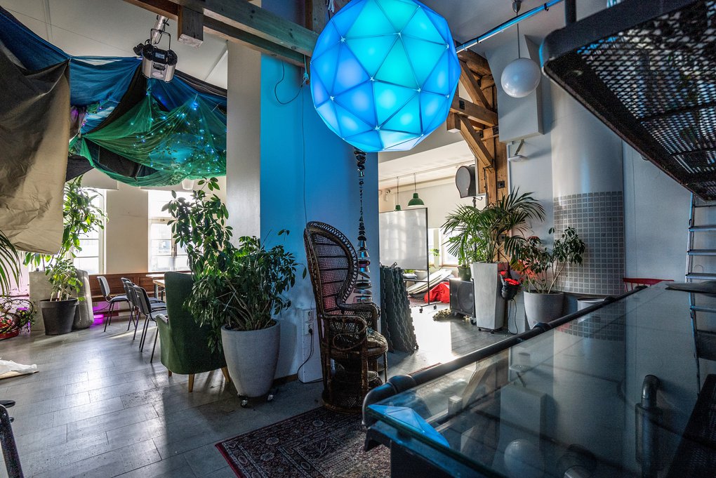 "alt": "Co-working in Stockholm. Blivande, a co-working space in Frihamnen that doubles as a night club.",