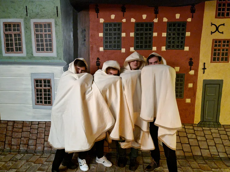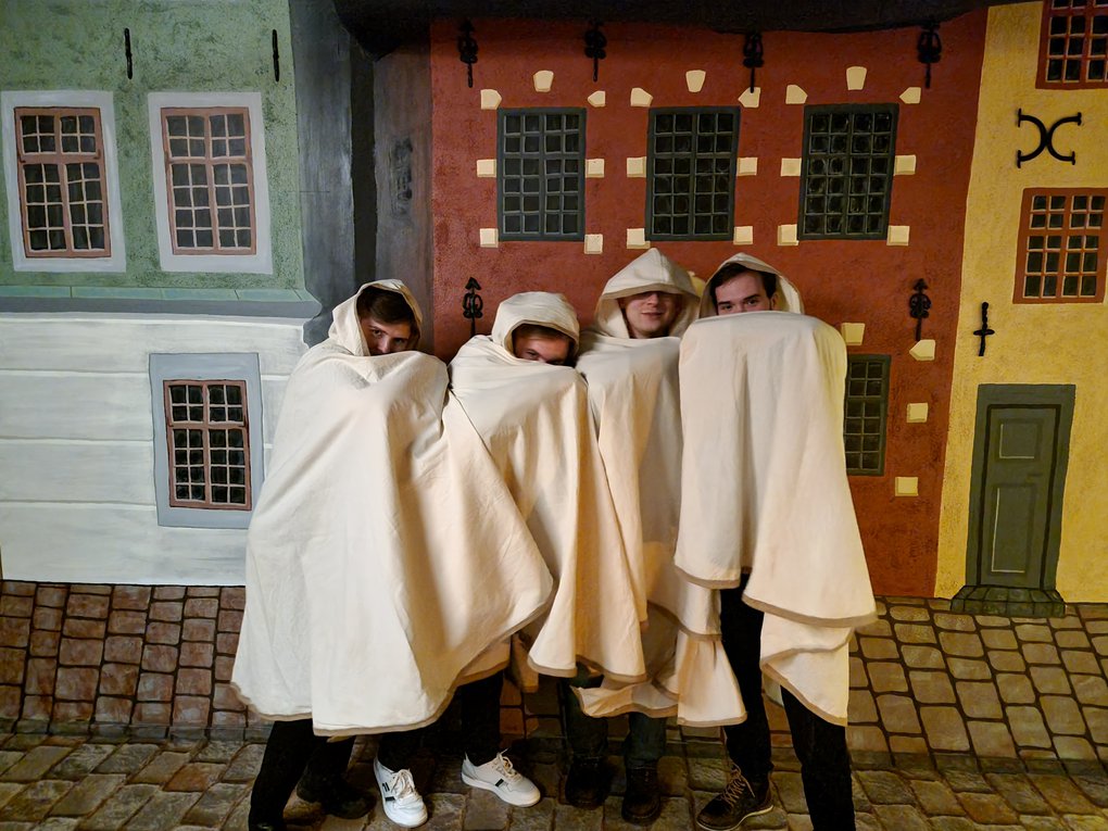 "alt": "4 people standing against a painted backdrop of the Stockholm Old Town square. They smile and hide their faces behind beige cloaks.",