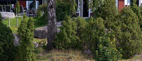 "alt": "A leafy garden with pine trees and shrubs in front of red cottages.",