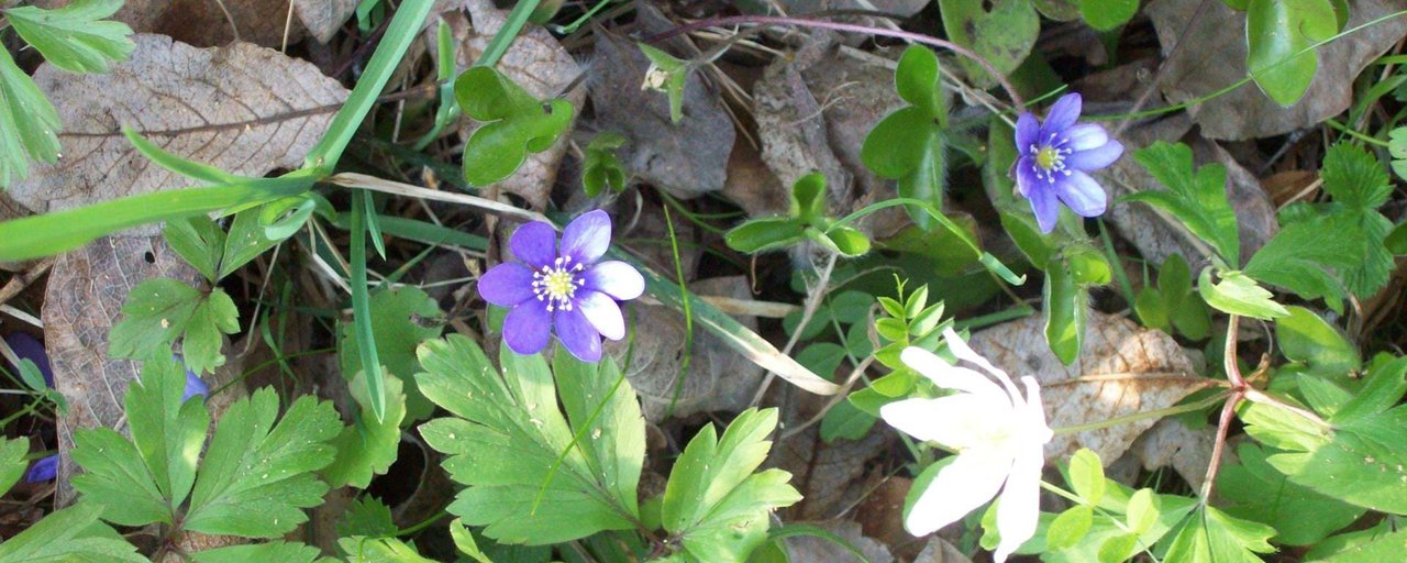 "alt": "Close-up of blue hepatica and white wood anemones in the wild.",