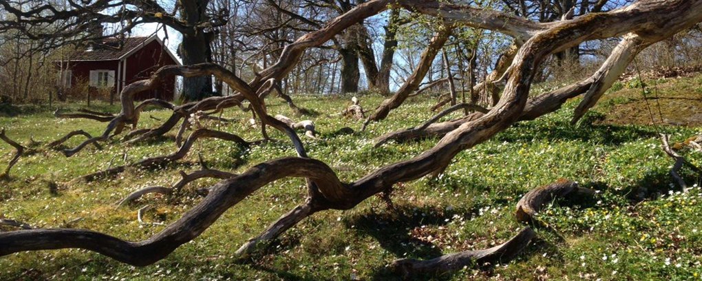 "alt": "An ancient, windswept tree with long, gnarled branches on a flowering meadow with white flowers, with a traditional red cottage in the background in Norra Malma nature reserve.",
