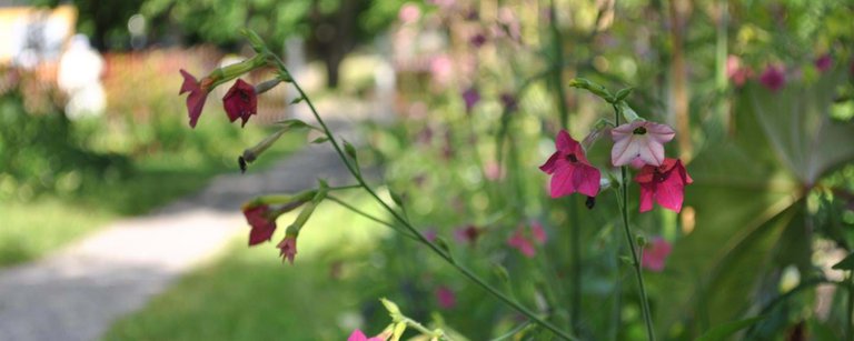 "alt": "Färgglada blommande klockor längs en suddig trädgårdsgång.",