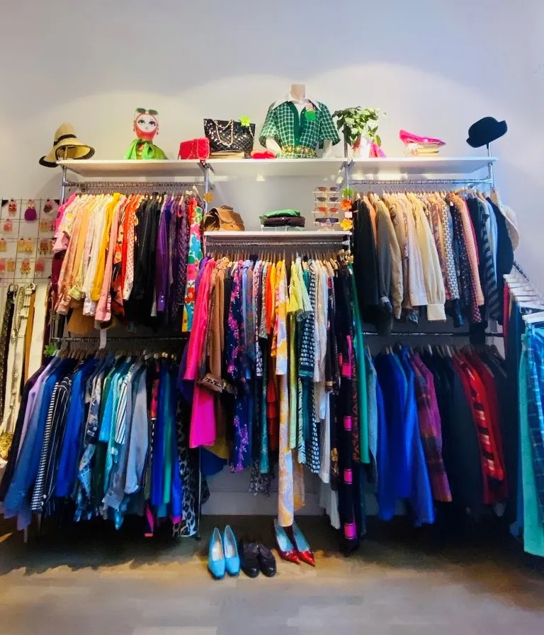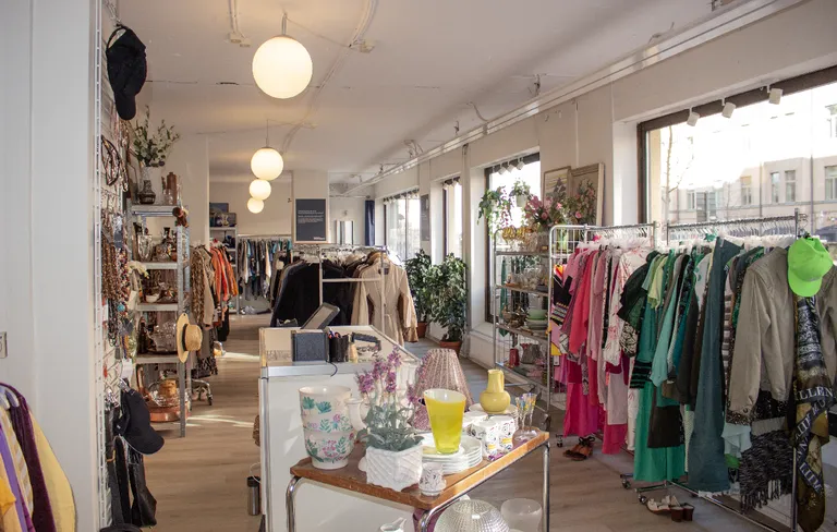 "alt": "Secondhand shops in Stockholm. Clothes are haning in Slow Fashion Hub on Södermalm.",