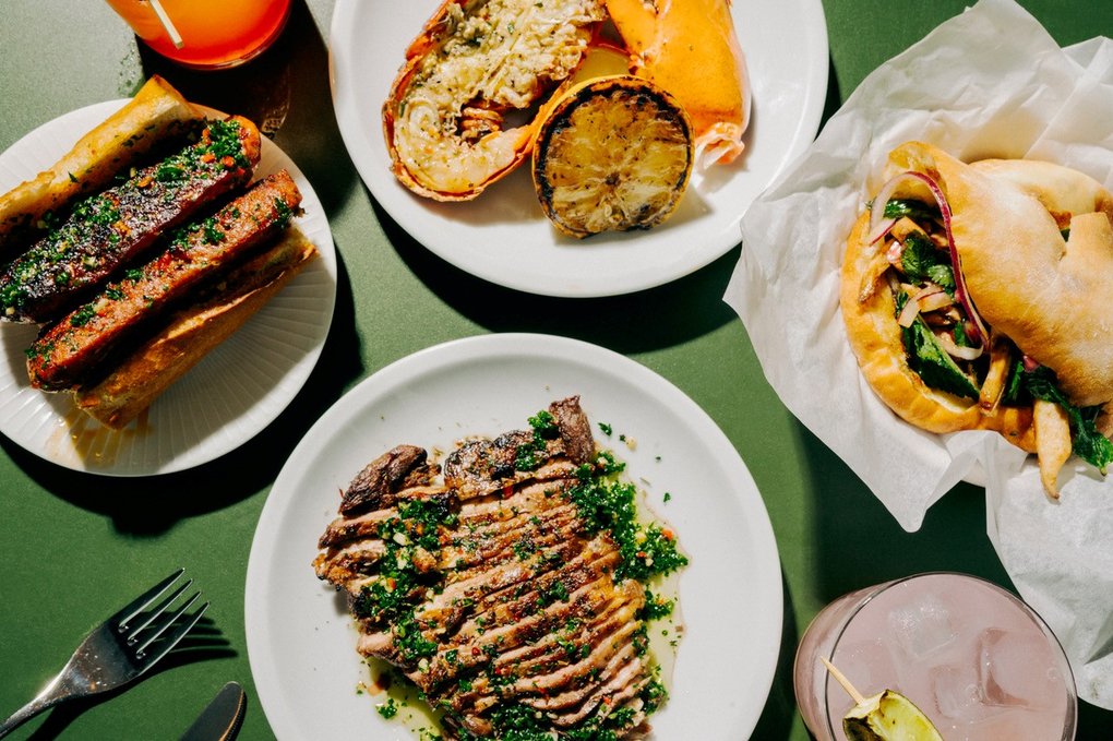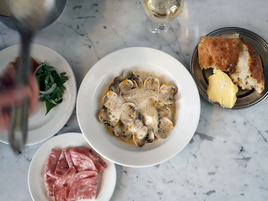 "alt": "A table with several platse of food and glasses with various drinks at Pelago, a summer restaurant in Stockholm.",