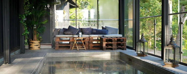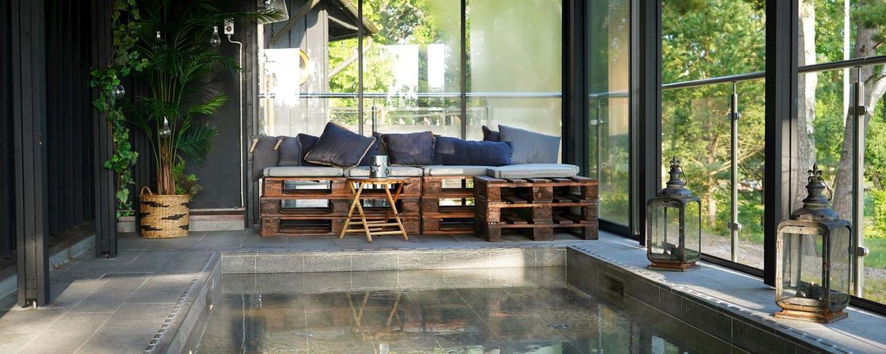 "embeddedTextCaption": "A relaxing spa area with seating made from pallets and soft cushions, large windows overlooking greenery.",