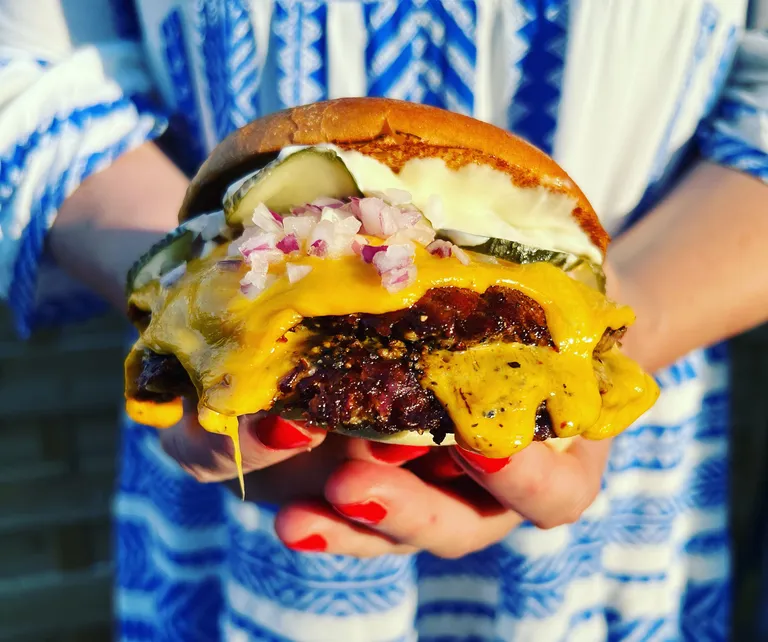 "alt": "Restaurant in Stockholm. Close up of a woman is holding a hamburger at Bonden & Burgaren.",