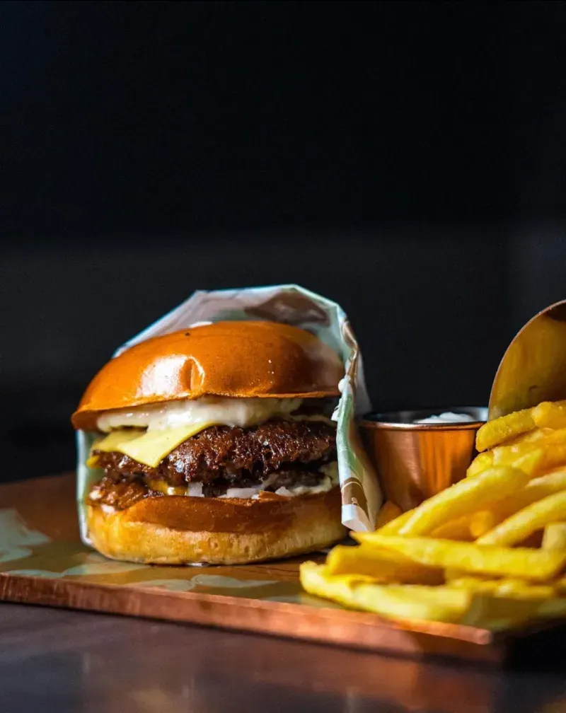 "embeddedTextCaption": "Close up of a hamburger and fries at Stockholm restaurant BAP.",