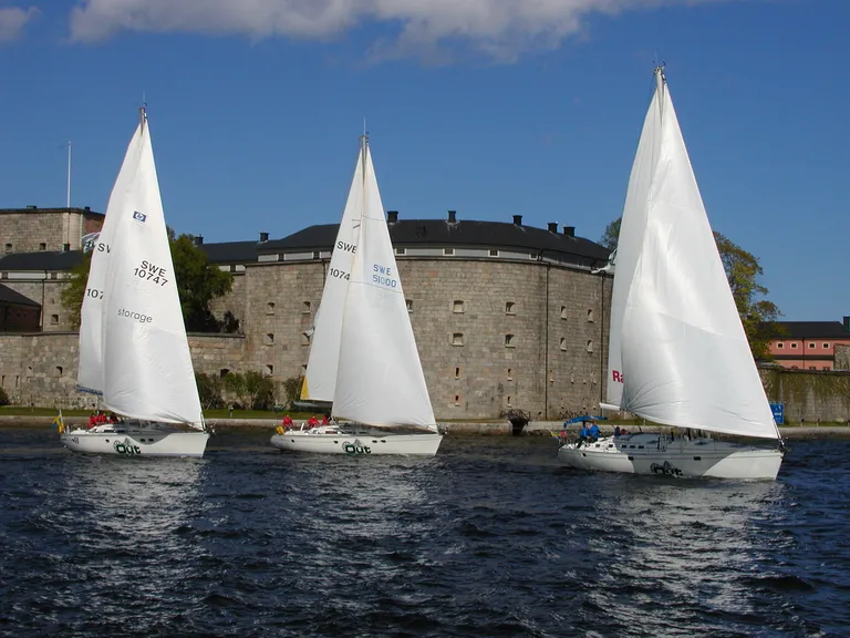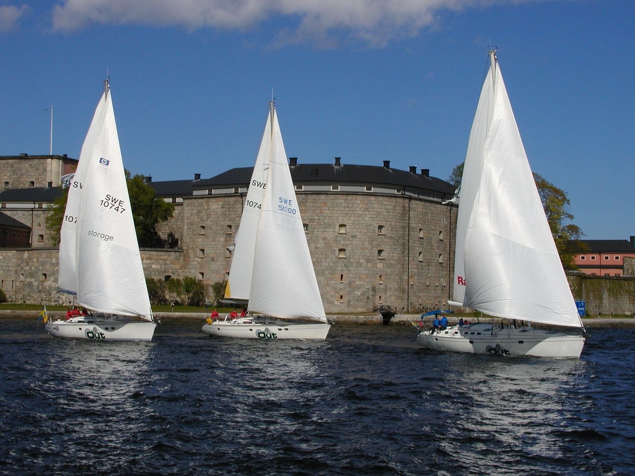 "alt": "Three sailboats at Vaxholm Castle.",