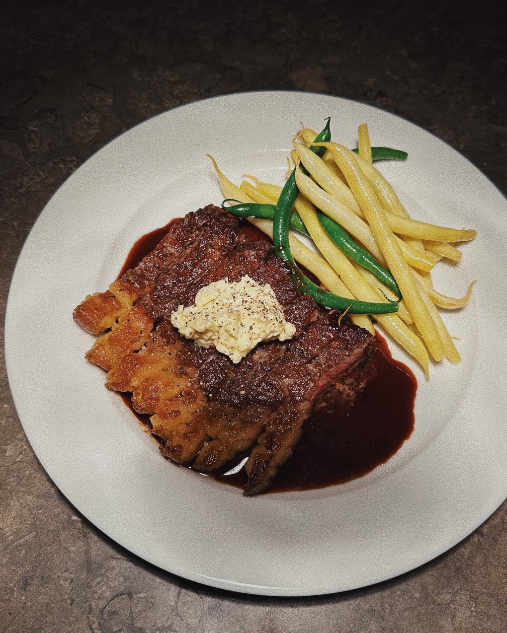 "alt": "A steak served with garlic butter and haricots verts.",