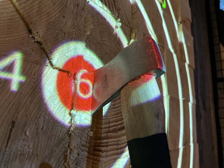 "alt": "A throwing axe set in the wooden bulls-eye of a target board",