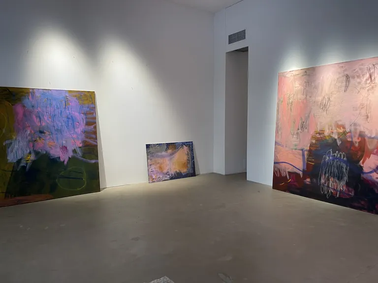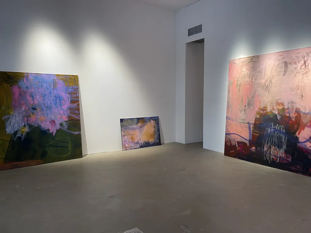 "alt": "Art gallery with big paintings leaning against the wall.",