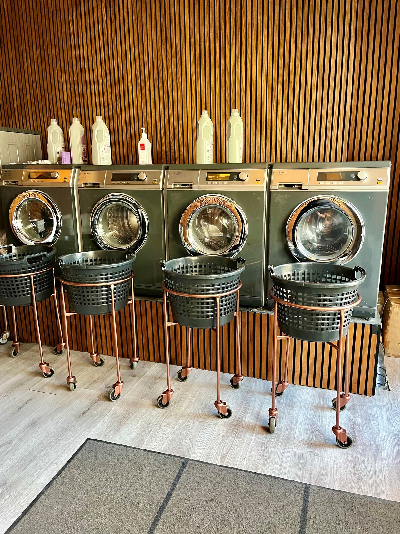 "alt": "Green laundry machines in a row",