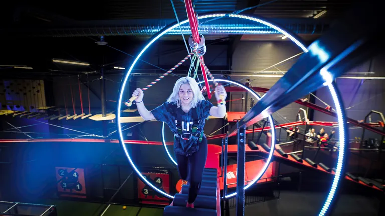 "embeddedTextCaption": "Person in a harness glides along an elevated track through LED-lit rings in an indoor park.",