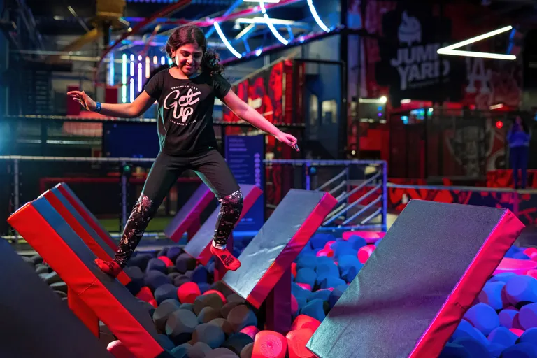 "embeddedTextCaption": "Child balances across tilted padded platforms over a foam pit in a neon-lit trampoline park.",