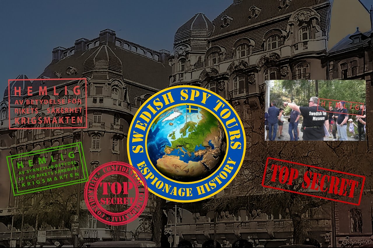 "embeddedTextCaption": "A promotional image for “Swedish Spy Tours: Espionage History,” showing a historic European building in the background with various “Top Secret” and “Hemlig” stamps overlaid.",