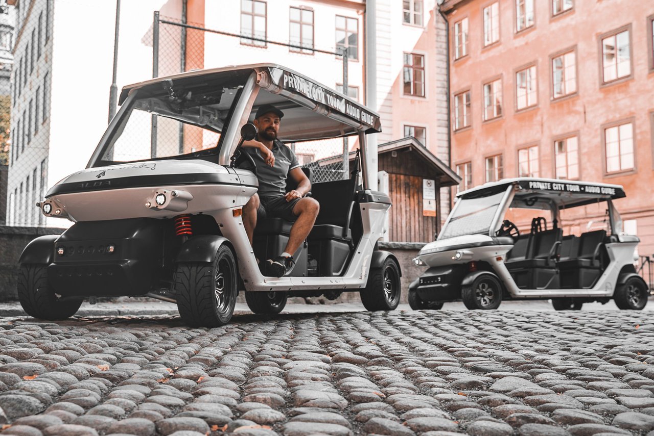 "alt": "Electric golf carts for private city tours in Stockholm’s Old Town"