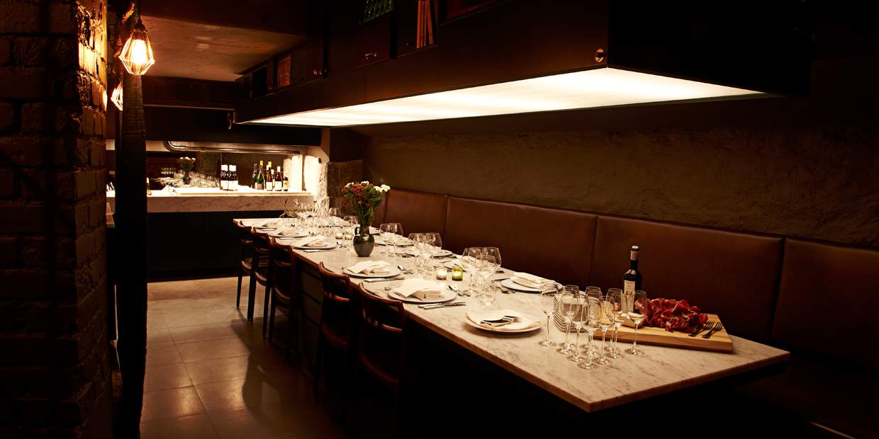 "title": "The dark interiors and brown hues at Mäster Anders restaurant in Kungsholmen. A long leather sofa runs along one of the brick walls and the light fixtures are hanging low.",